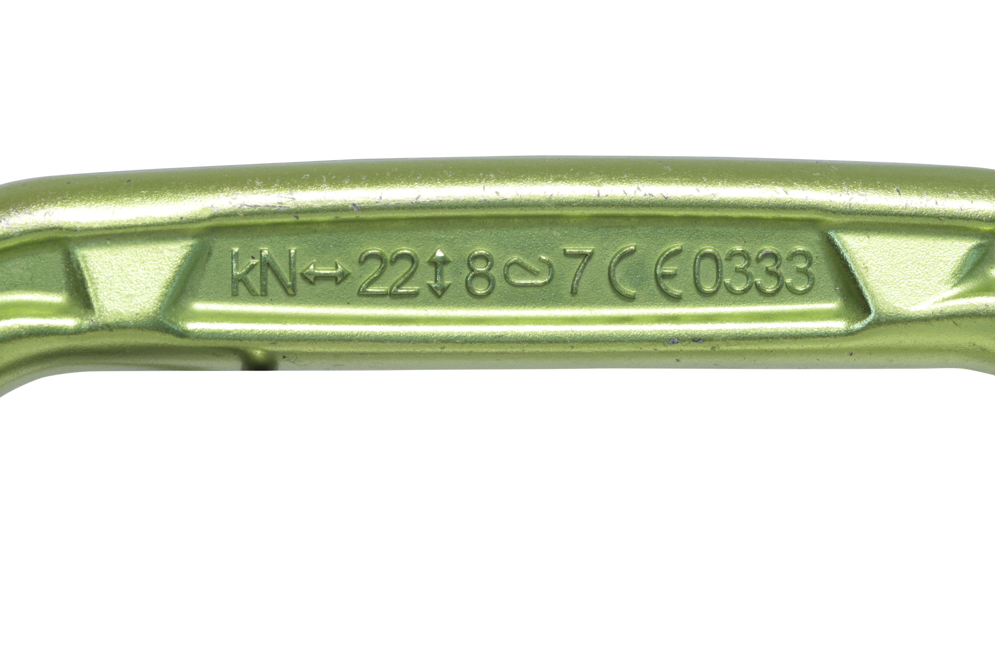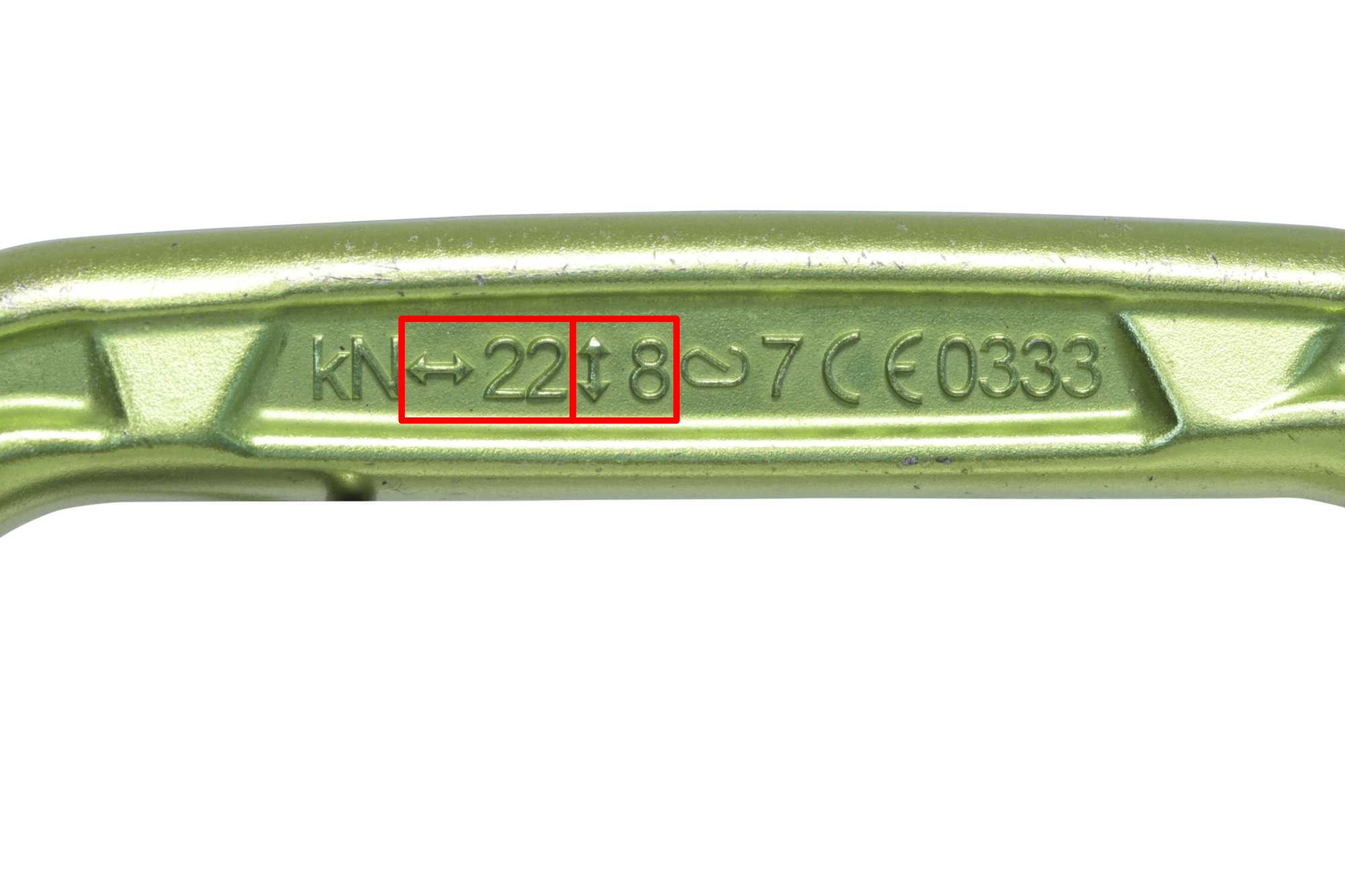 The maximum strength of the karabiners is therefore obtained when the working load is applied to the main axis. But the karabiner gate must also be properly closed. Otherwise, the resistance is greatly reduced as shown by the 3rd engraved value.