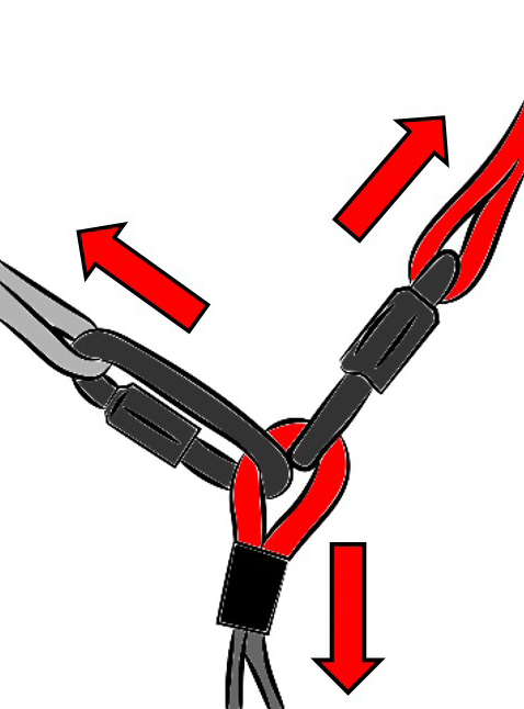 It is also possible to consider connecting the straps directly to each other using a "lark's head" knot, and thus avoid a connector and the constraints it can entail. Despite the bad image that this knot may still have, it is very effective when executed correctly (like all knots!). Care must be taken to ensure that the connected straps are kept as flat as possible, and that the knot cannot loosen or allow for relative movement between the straps. Indeed, there is a significant risk of breakage if tension is applied following a long slide that will induce friction and therefore heating.
