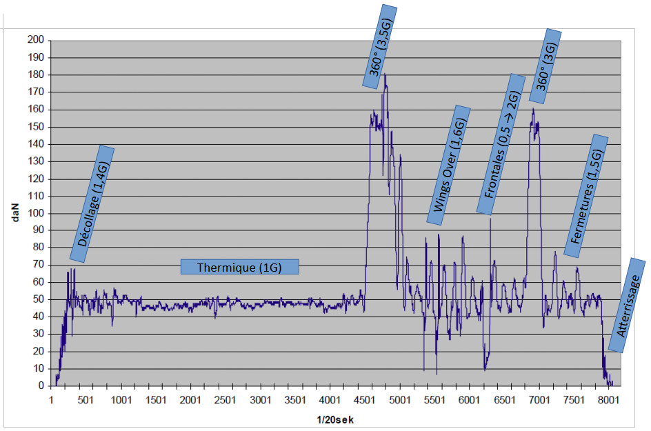 Measurements in stable straight flight, stabilised spiral, frontal collapse, collapse and wing-over (Source: DHV).