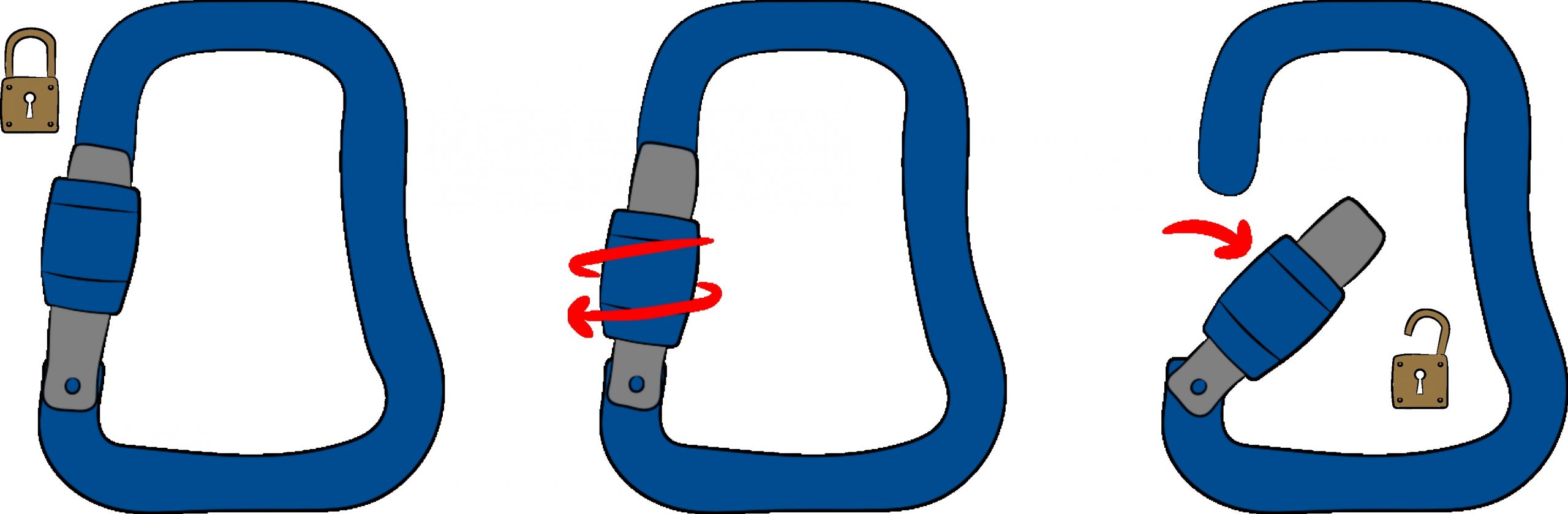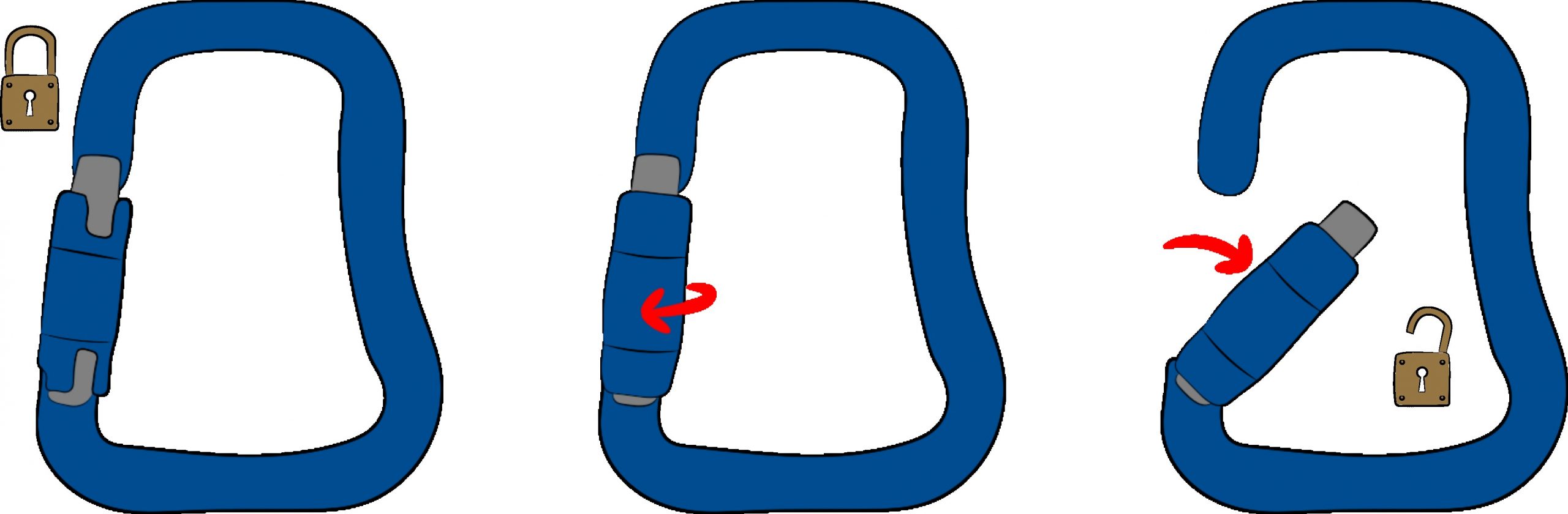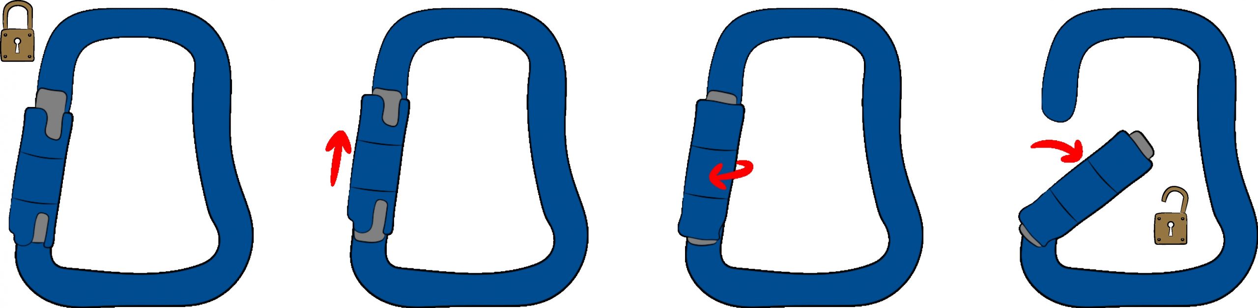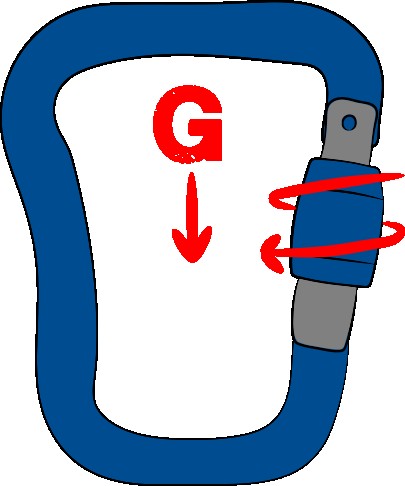 On the other hand, to avoid any accidental opening that would reduce the resistance, the user must perform one or more specific actions in order to release the gate. This may involve a quarter turn on the gate before pushing it (2 steps), or require a small movement of the ring before applying the quarter turn to it (3 steps). These systems may sometimes seem a little "complicated" and require both hands to successfully open the karabiner, but considerably limit the risk of finding yourself in flight with an open gate karabiner which will then have lost more than half of its resistance.