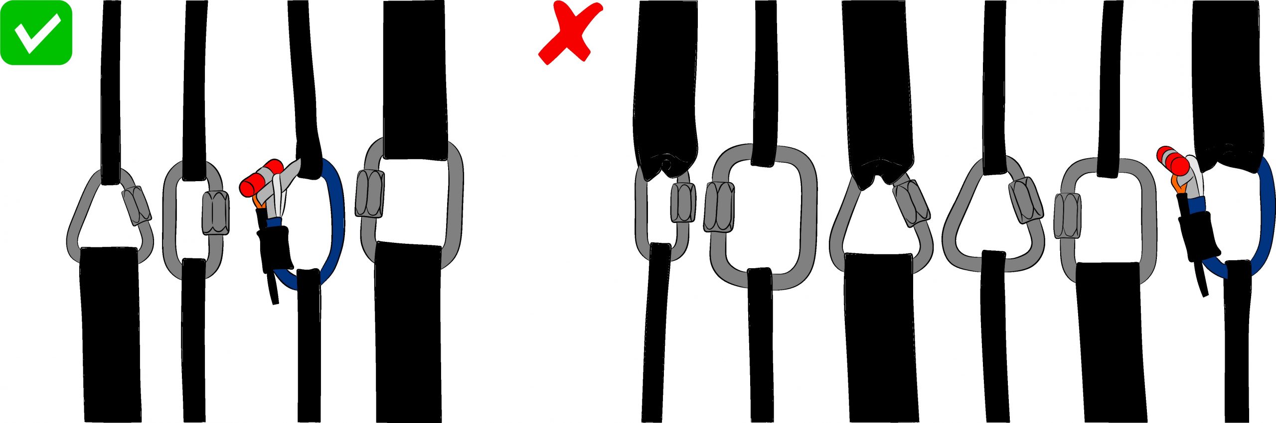 – The first aims to hold the connector in place using O-rings to keep the straps in place on the connector. This prevents unwanted rotation of the carabiner when the load is low, but in the event of a heavy load the O-ring can still slip and allow the strap to move. This is especially true when the strap is much narrower than the carabiner.