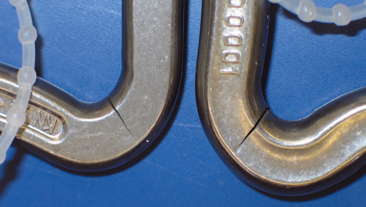 This fatigue phenomenon should be taken seriously, as it can cause the karabiner to break even if it has never been subjected to a high load during its use. In addition, the crack initiation is internal and cannot be easily detected. This is why it is important to know the history of the connectors, and to change them before it is too late... Aluminium is much more sensitive to this than steel because of its internal crystalline structure. On the other hand, other connectors such as quick links or soft connectors (Soft-links and others) do not seem "a priori" to be affected by this fatigue phenomenon.