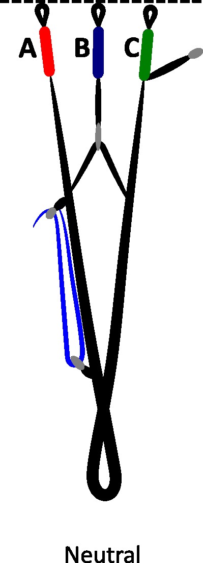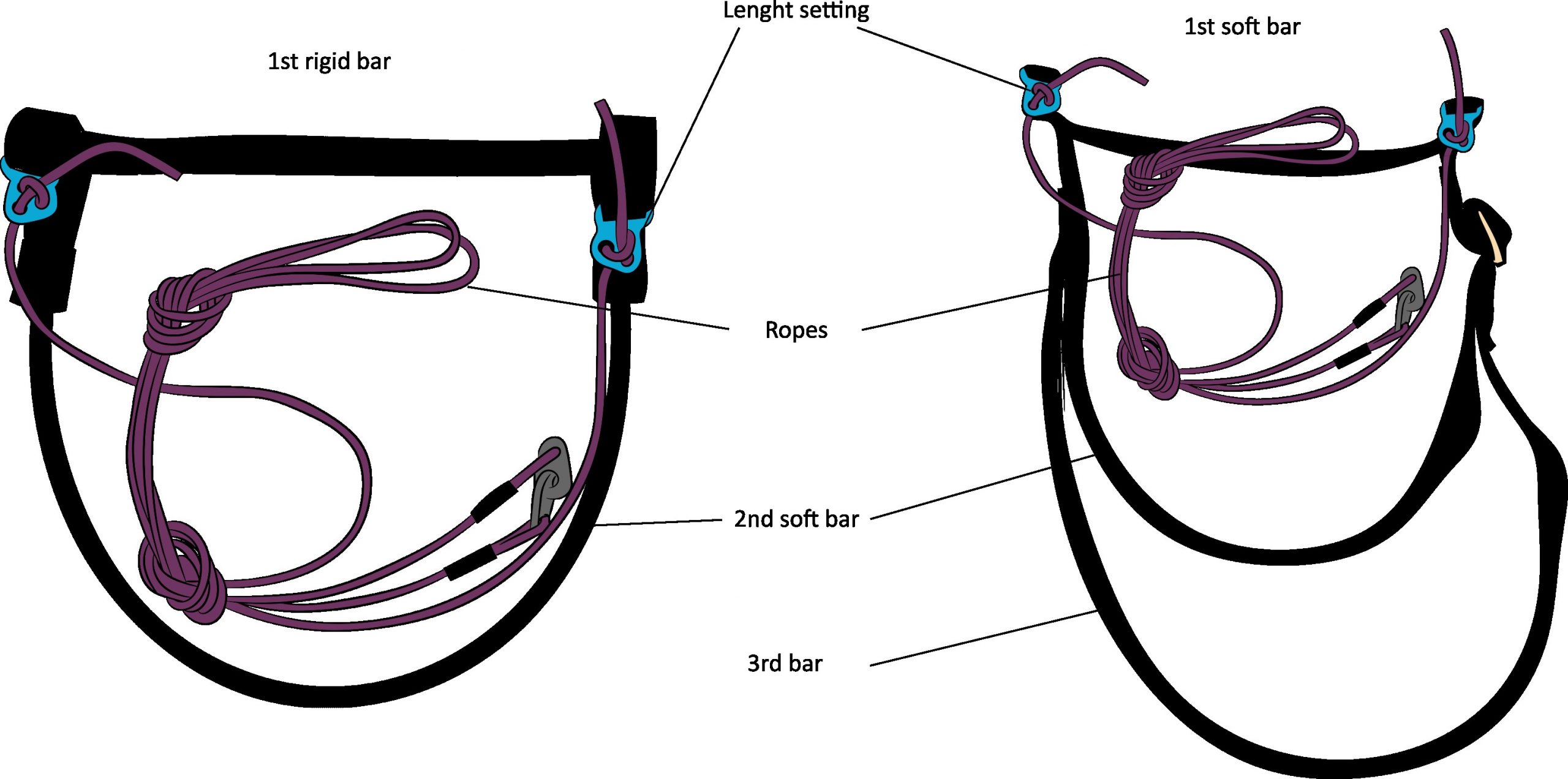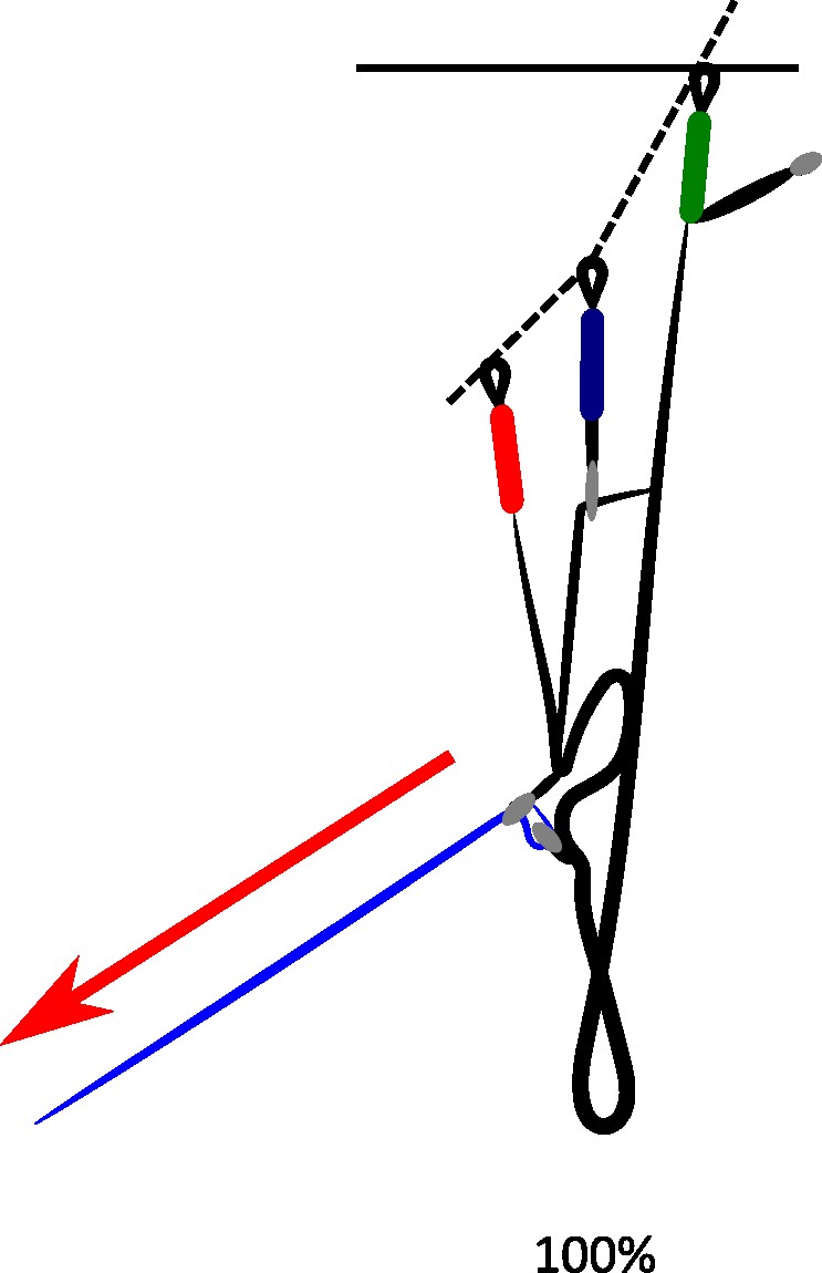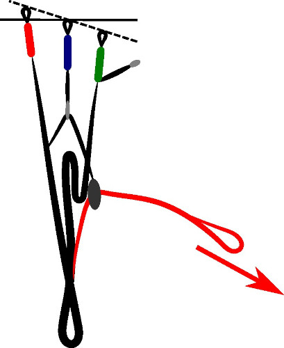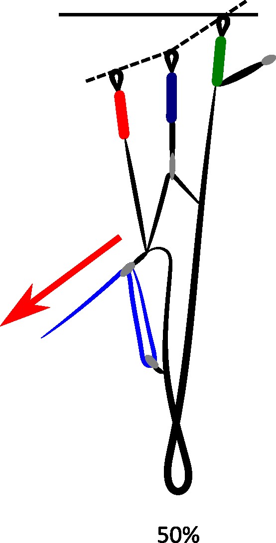 By pushing on the bars with the feet, the pilot acts on the cords which activate the system installed on the risers. This system will then accentuate the angle of attack and generate an increase in the airspeed of the wing. The A / B / C risers are shortened linearly or not. Some systems even allowed the rears to be released when the fronts are lowered. But this system was quickly abandoned because in the event of a frontal collapse the phenomenon was amplified! The 2-pulley pulley system (in blue on the diagram) reduces the effort required on the foot.