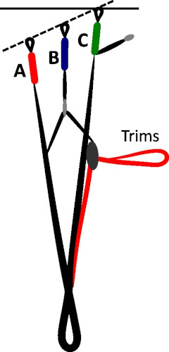 If we want to increase the speed of a wing, we will therefore have to increase its attitude angle to make it more diving. To do this, there are now 2 systems: the foot accelerator, and the trims (also called displays). Both use the same principle: deforming the risers to vary their relative lengths in order to modify the nominal setting.