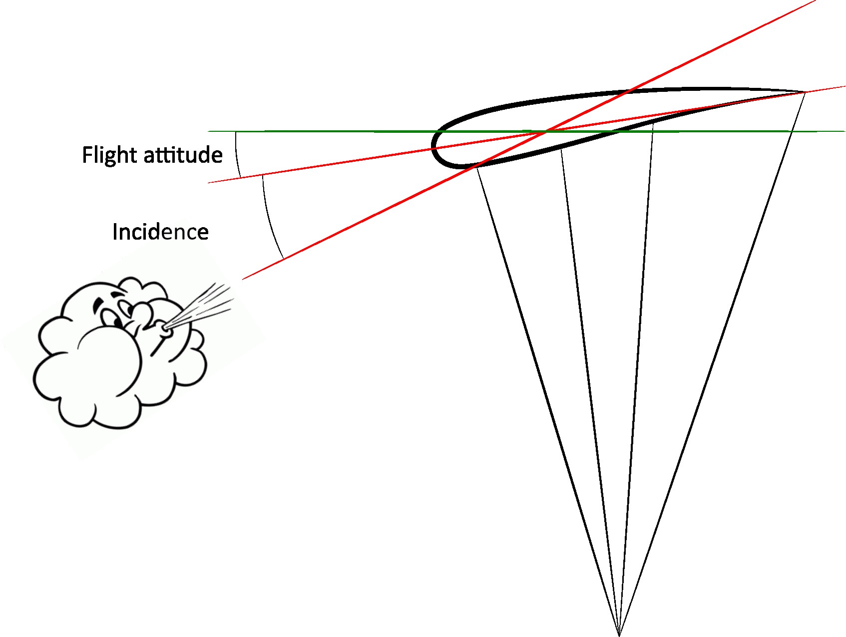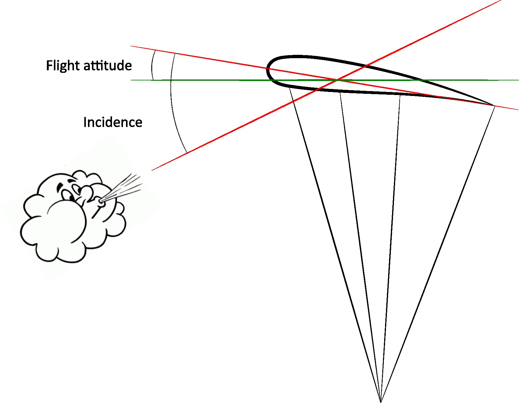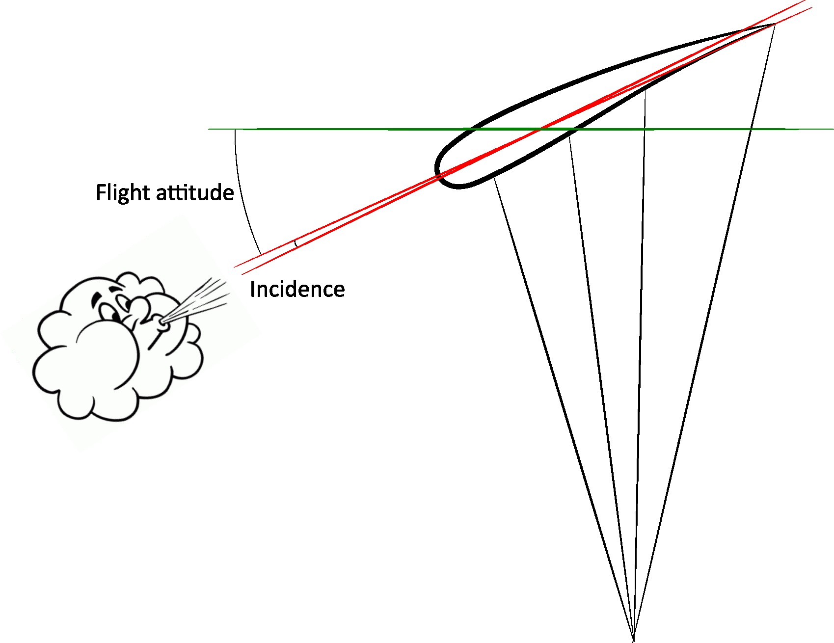 To allow aerodynamic forces to come into play and make flight possible, it is necessary for the air streams from the relative wind to attack the glider at a given angle: the angle of incidence. It is formed by the plane of the glider and the direction of the relative wind (also corresponding closely to the air trajectory of the paraglider). This angle is directly related to the attitude of the paraglider, which corresponds to the angle that the plane of the wing makes with the horizontal.