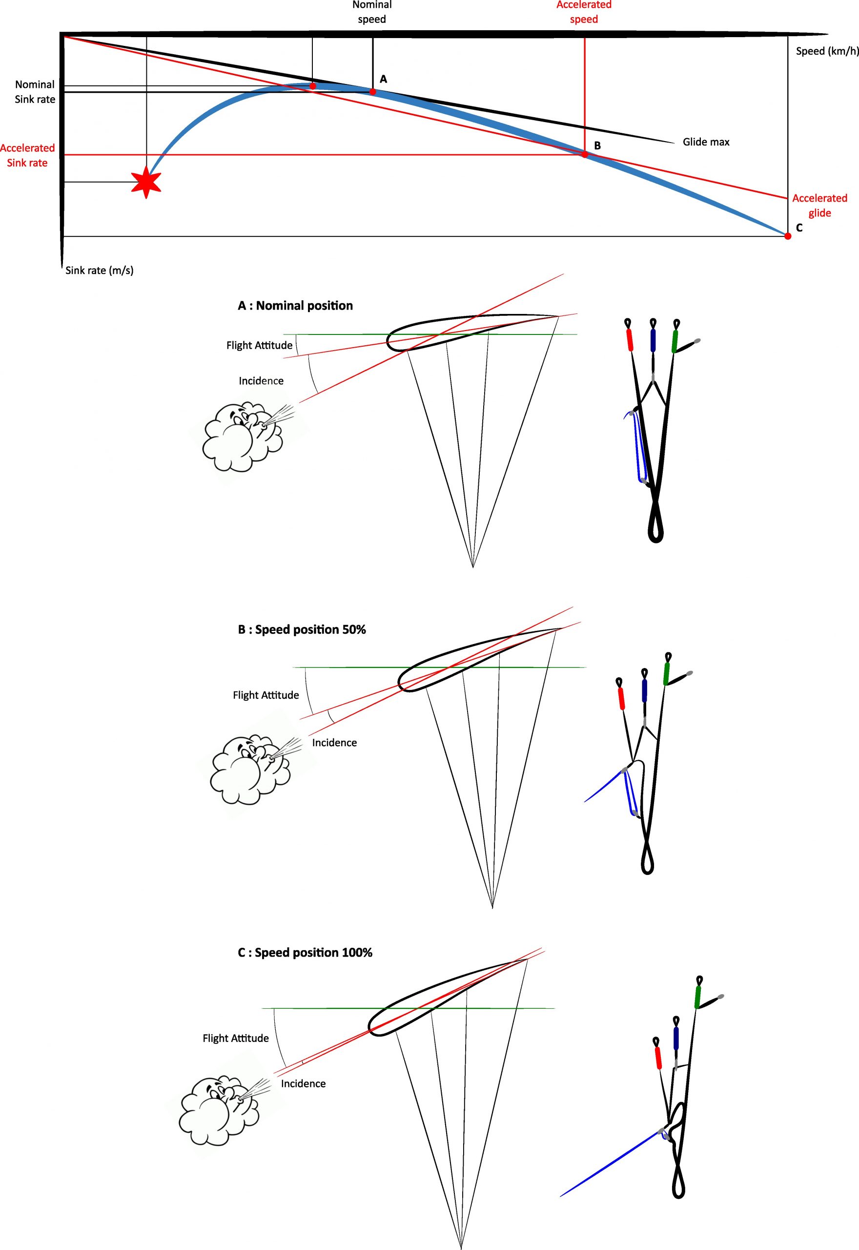 It is therefore sufficient to operate the accelerator or the trims to modify the setting and the attitude, and to allow the wing to pick up speed. Between the angles of attitude and incidence, the interactions are numerous and complex. In our case concerning acceleration and increasing speed, we will simplify and consider that the more pitched the attitude, the lower the angle of incidence.