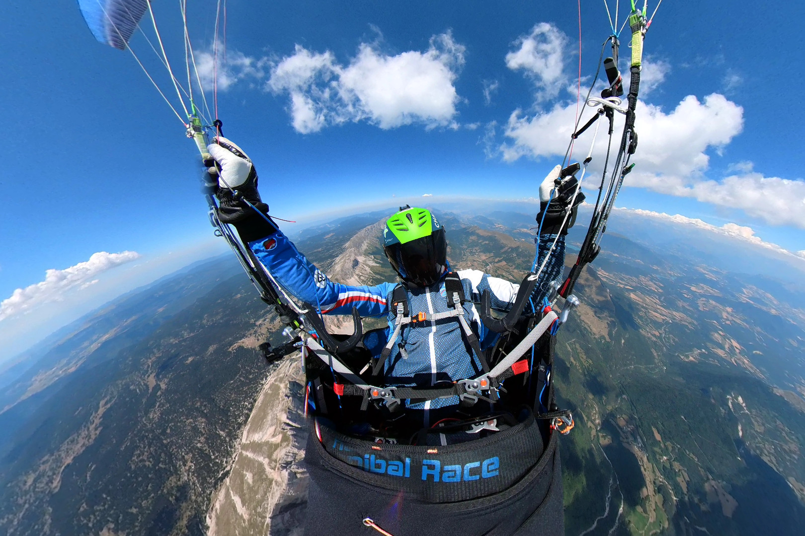 In competition or cross-country, or more generally in performance flight, you must constantly juggle with the fixed objective, the timing, and the aerological conditions encountered. It is sometimes better to lose glide ratio to arrive more quickly in a generous lift, or sometimes optimise your sink rate as much as possible to gain height in thermals before transitioning to the next relief. The cases are multiple and varied and could be the subject of an entire course, but that is not the point here. For those who would like to deepen the subject, I advise you the excellent video by Baptiste LAMBERT on the Mc Cready. To simplify, you can remember that facing the wind, the accelerator improves your glide ratio and speed relative to the ground. In accelerated transition, high-performance pilots even learn to control the pitching movements of their wing by playing with the accelerator, pushing or releasing at opportune moments. When this is not possible, they use the rear risers because this generates less drag than the use of brakes, and allows them to maintain maximum performance. We will see later that the use of brakes is to be proscribed when the accelerator is activated.