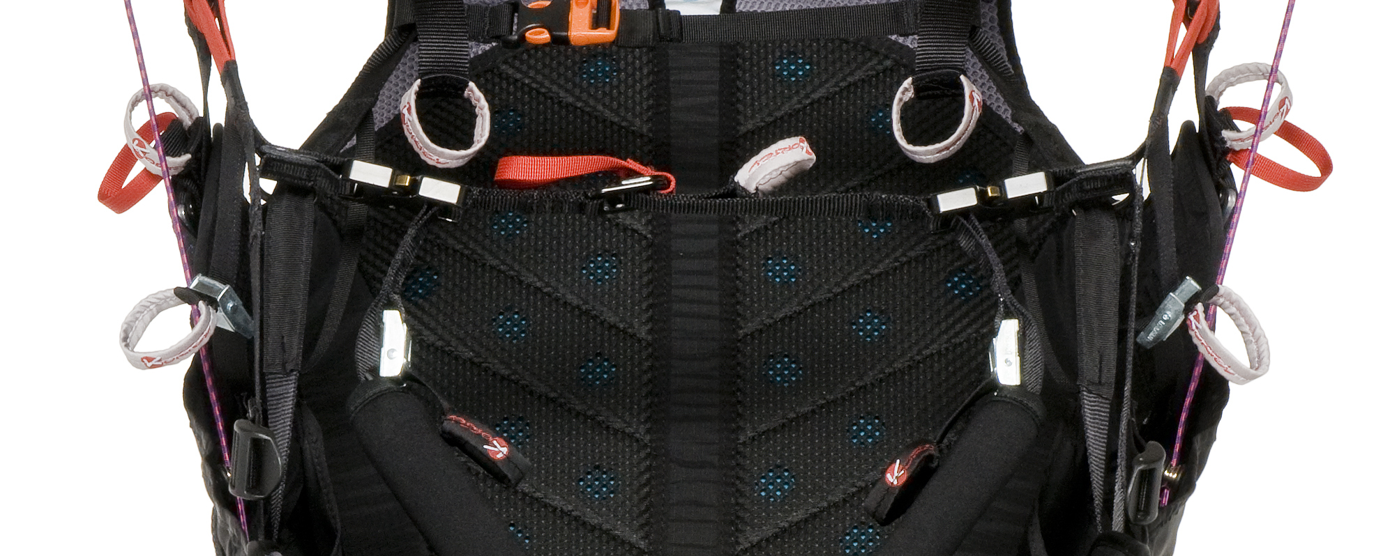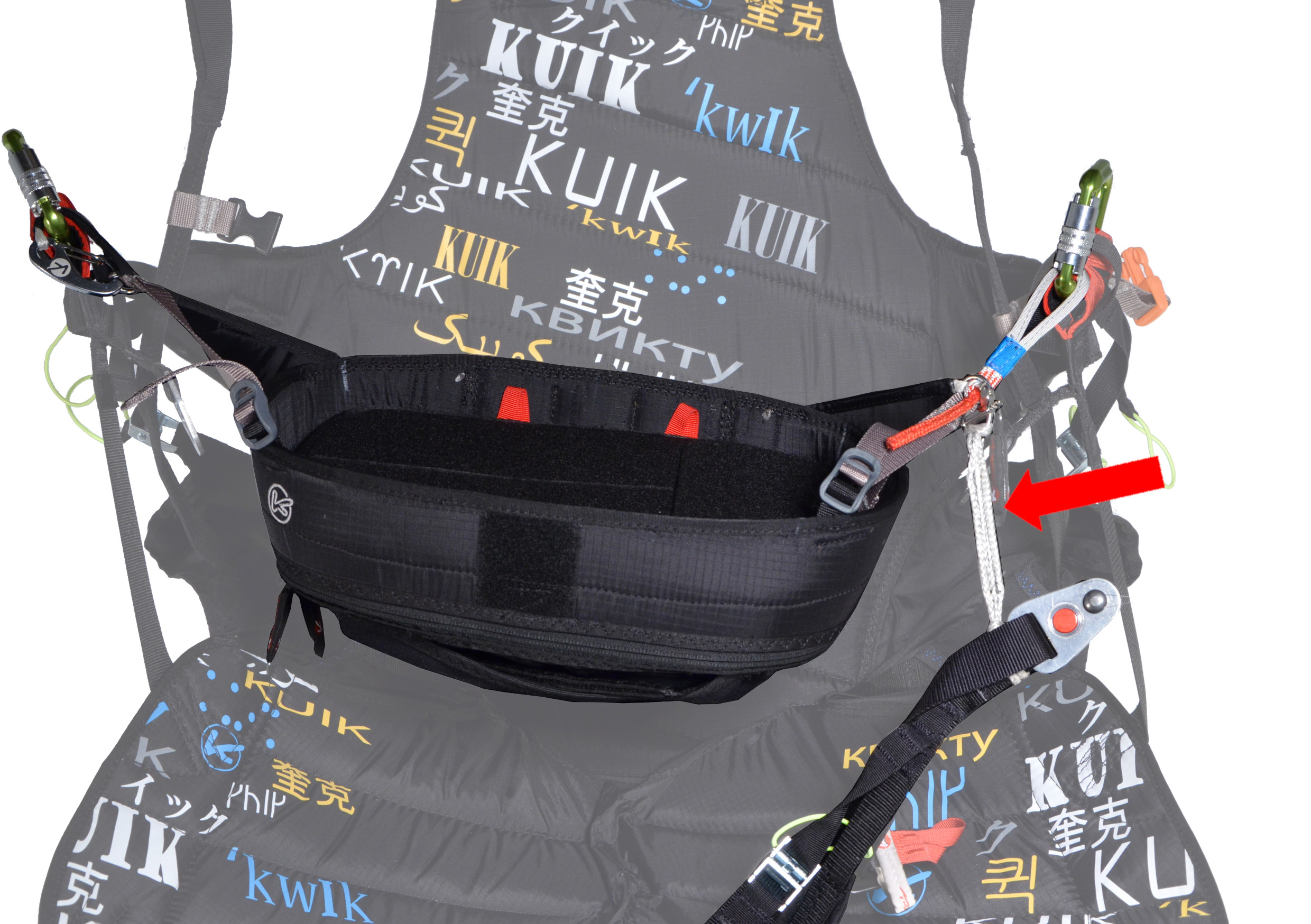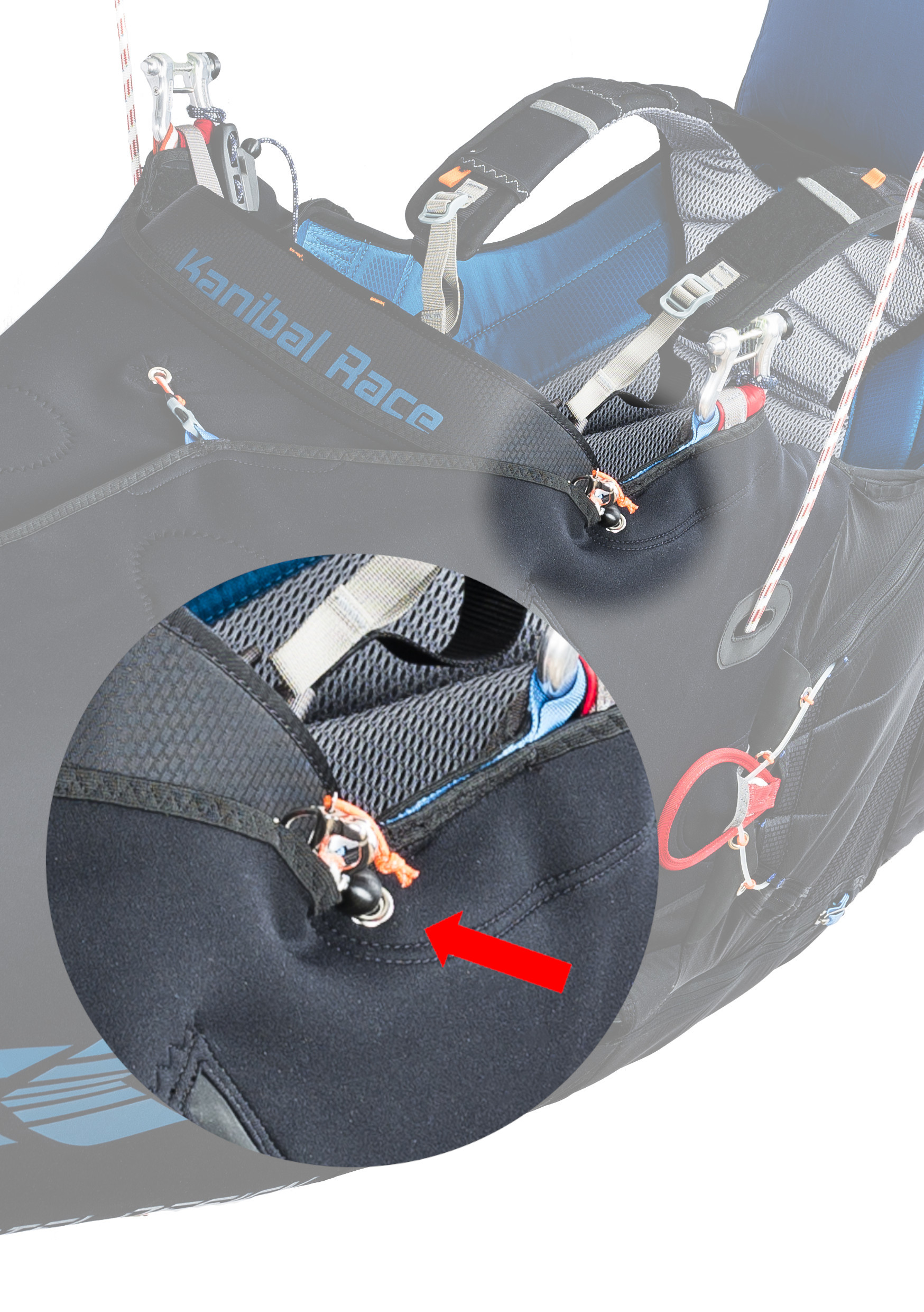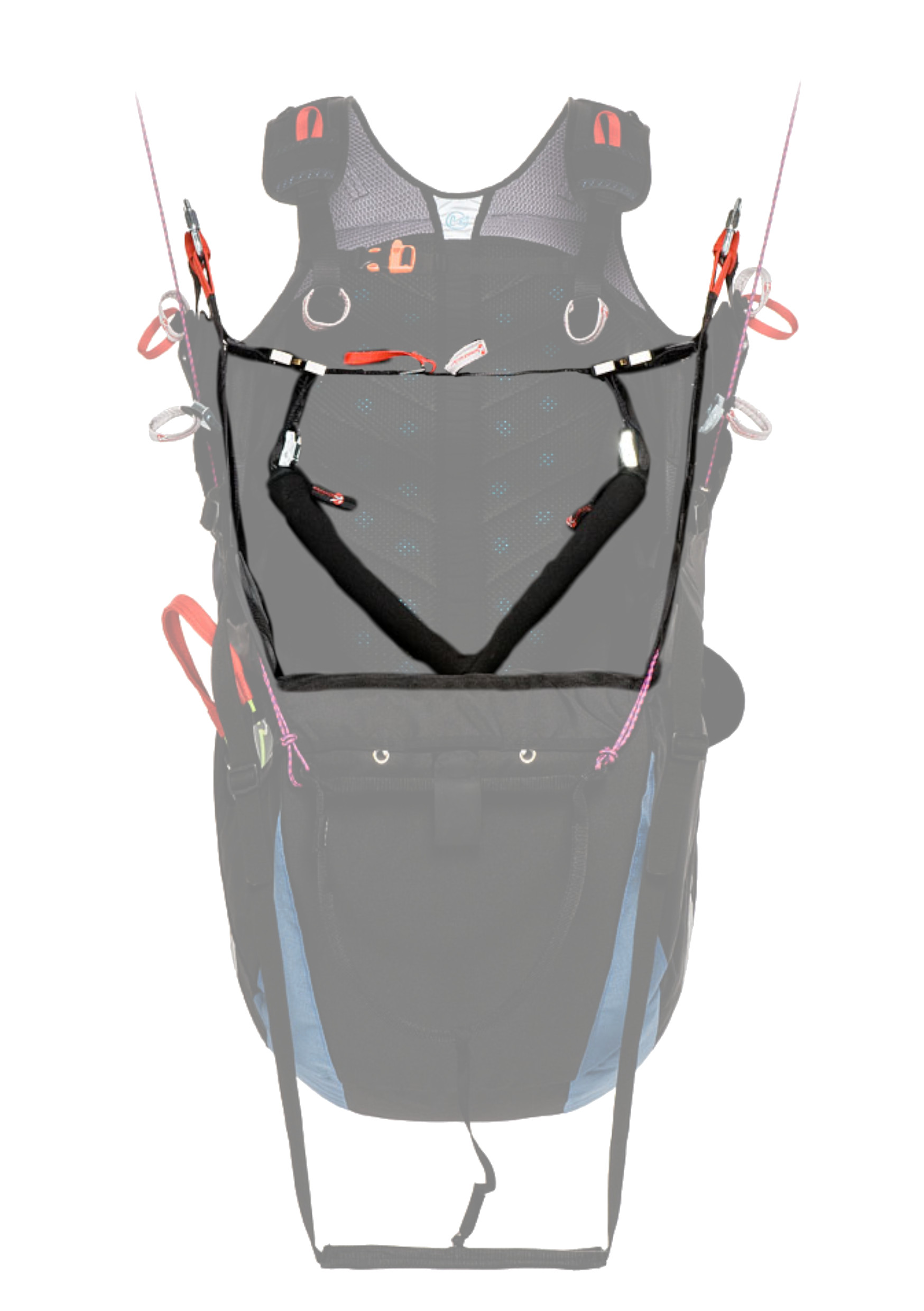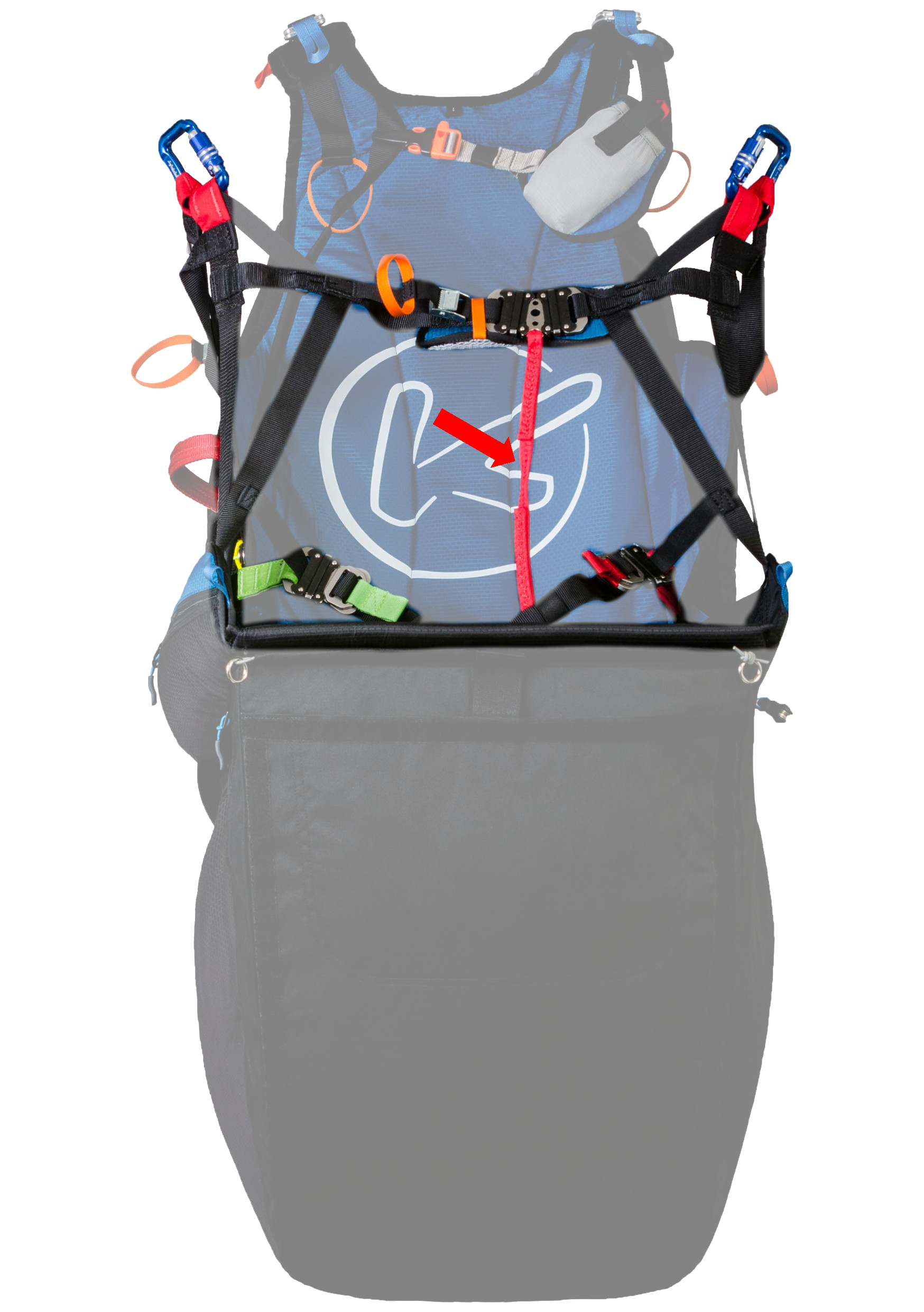 To date, the vast majority of harnesses with this geometry are equipped with an "anti-forget" strap (in red in the photo) which is attached to the strap of one of the thighs and has a part of the buckle that will lock the ventral strap. Thus, even if the thighs are not closed at take-off, or if they are reopened later (such as after a failed take-off to facilitate walking back up), this strap will prevent the harness from rising too high in the back. It will then potentially be possible to sit back correctly in the harness with the help of your hands, and close the buckles that remained open. However, pay attention to the length of this anti-forget device, because the longer it is, the lower the pilot will be and may no longer be able to use the brakes without risking stalling the wing!