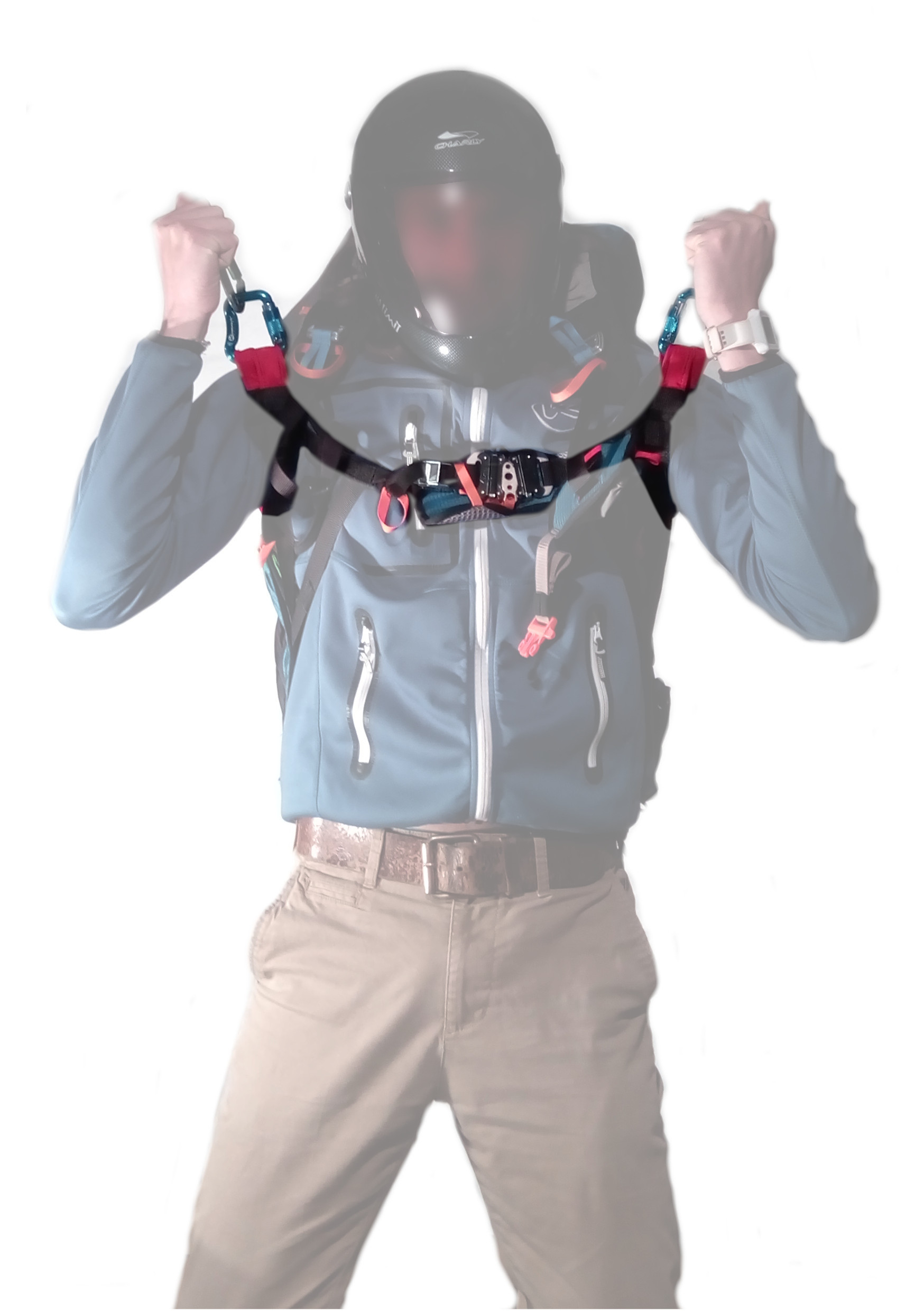It may also be that no strap is attached, and where the simple pressure of the shoulder straps can give the impression of having put on your harness completely! In this case, when the harness goes up, just let go of everything and raise your arms so that the harness can freely go up until it comes out without getting stuck, or do the same thing (arms up to get out so as not to get stuck) while keeping the brakes on so as to release the glider.